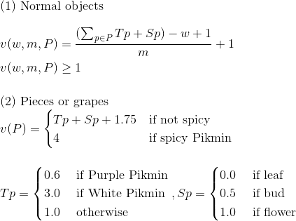 Fan-driven research has resulted in the following formula for the speed at which Pikmin carry an object, where w is the object's weight, m is the object's maximum carrier number, and P is the set of all carrier Pikmin. Sp refers to the stage of any given carrier Pikmin. The final number is in an arbitrary unit of speed.