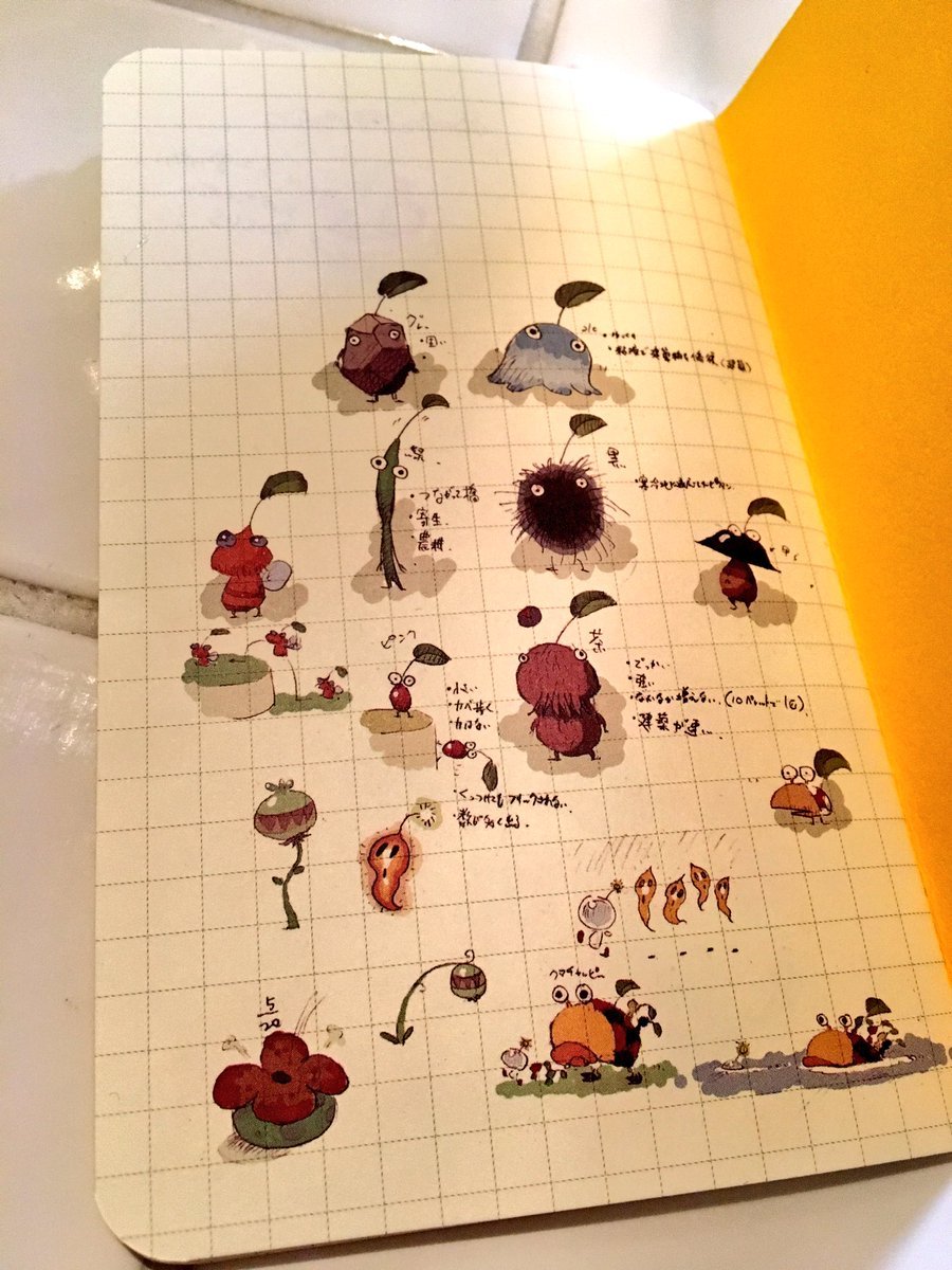 | Summary | A page of a notebook handed out at the 2014 Nintendo Game Seminar, featuring concept art for several Pikmin type-related ideas, including ones not making it into any of the games. |