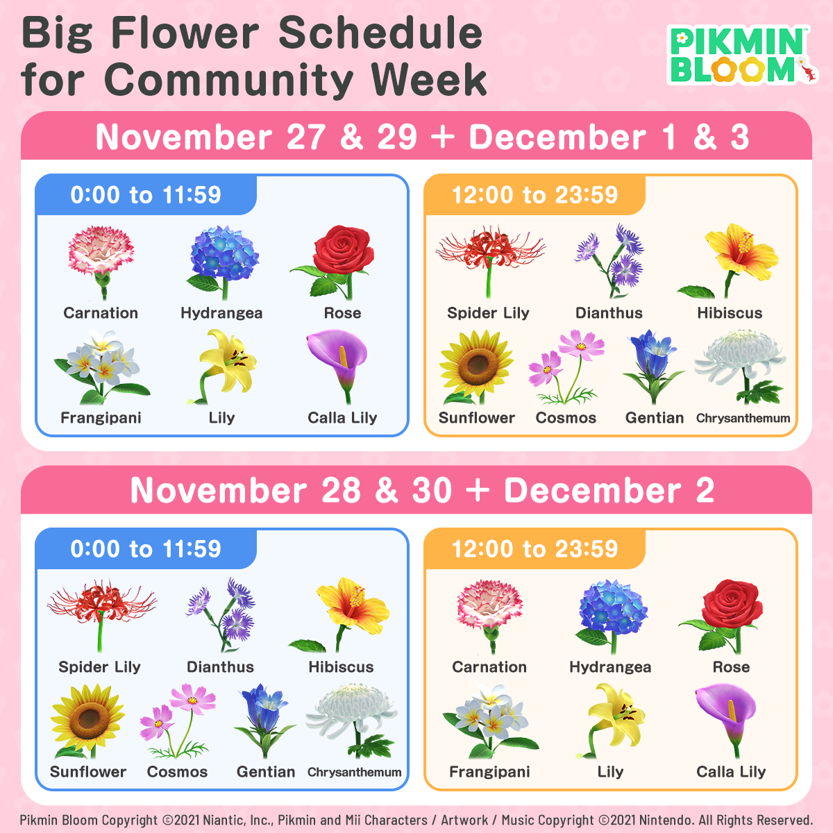 | Summary | The schedule for the types of Big Flowers that bloomed during the 2nd Anniversary Event in Pikmin Bloom. |