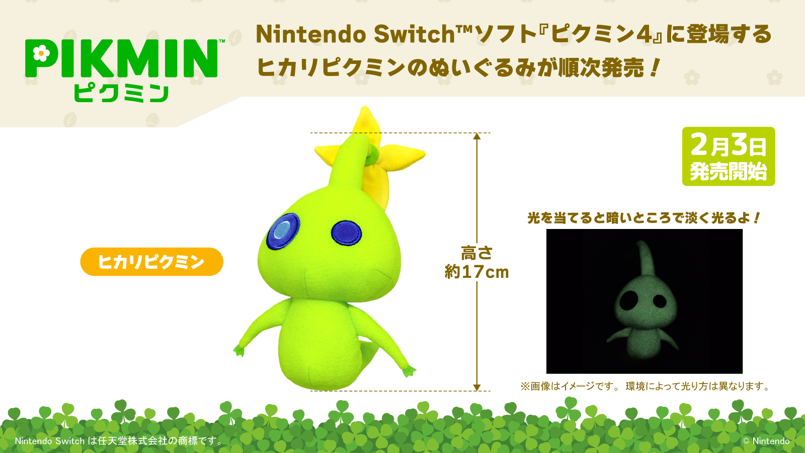 | Summary | Announcement image of the glow pikmin plush from san-ei boeki, as apart of their All Star collection plush line |