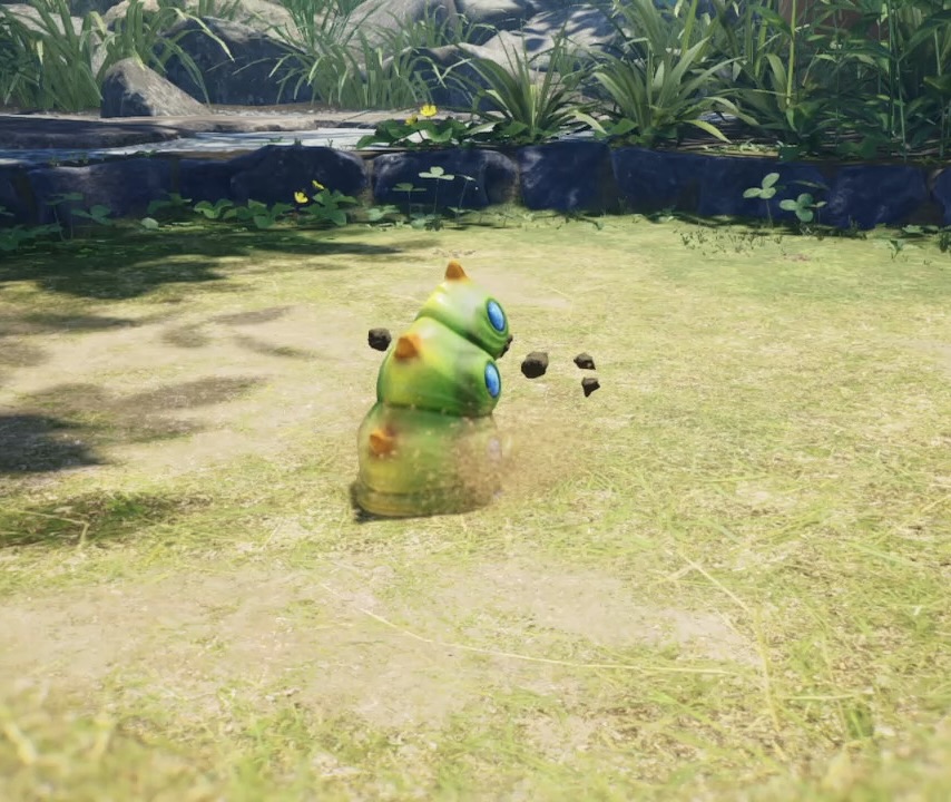 | Summary | A screenshot of a burrowing Armored Cannon Larva in Pikmin 4. |