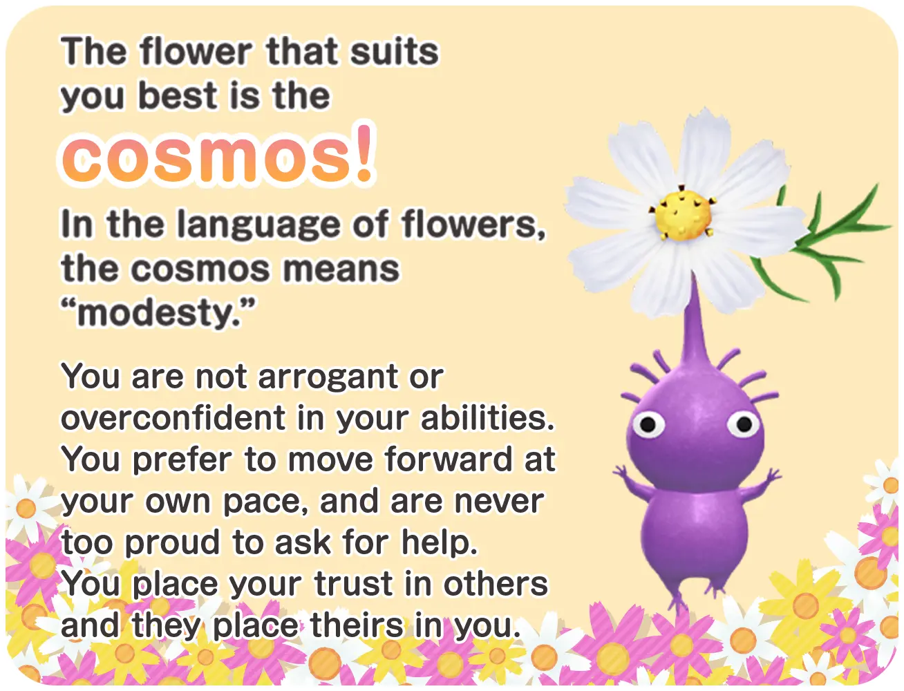 | Summary | The cosmos result, from the Pikmin Bloom Flower Personality Quiz. |