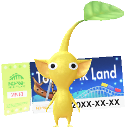 | Summary | A Yellow Theme Park Decor Pikmin with Theme Park Ticket decor from Pikmin Bloom. |