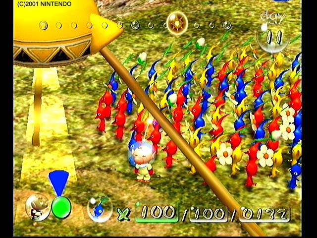 | Summary | A screenshot of an early version of Pikmin showing Olimar and his Pikmin standing in front of the Yellow Onion in an unused area. |