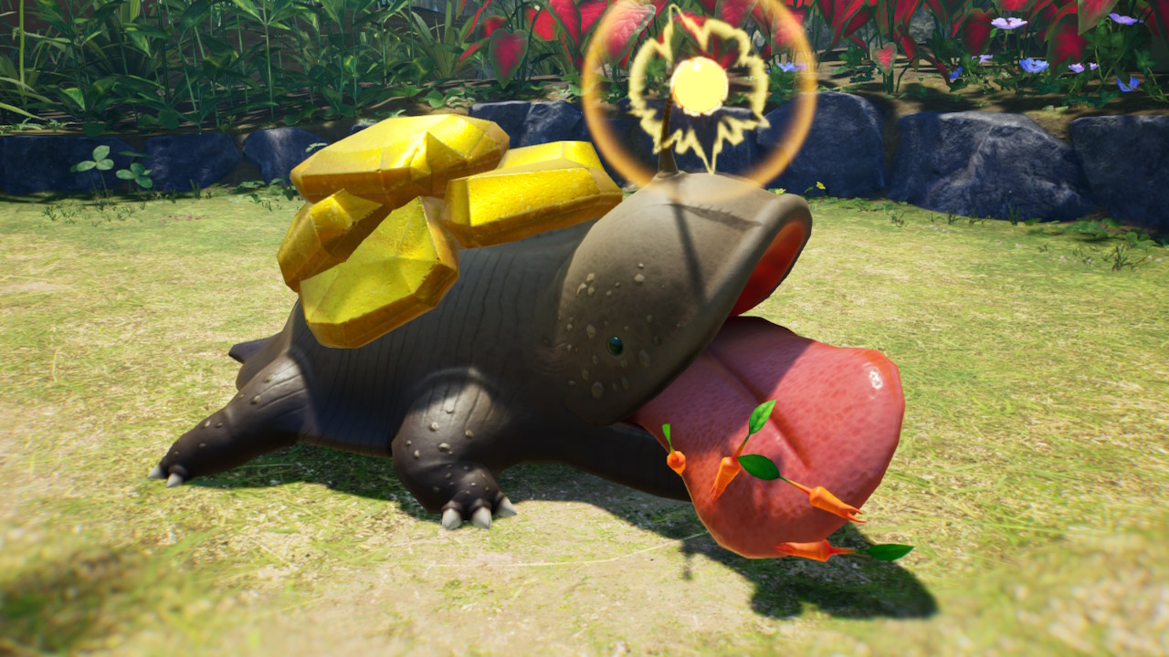 | Summary | A screenshot of a Gildemander eating pikpik carrots in Pikmin 4. |