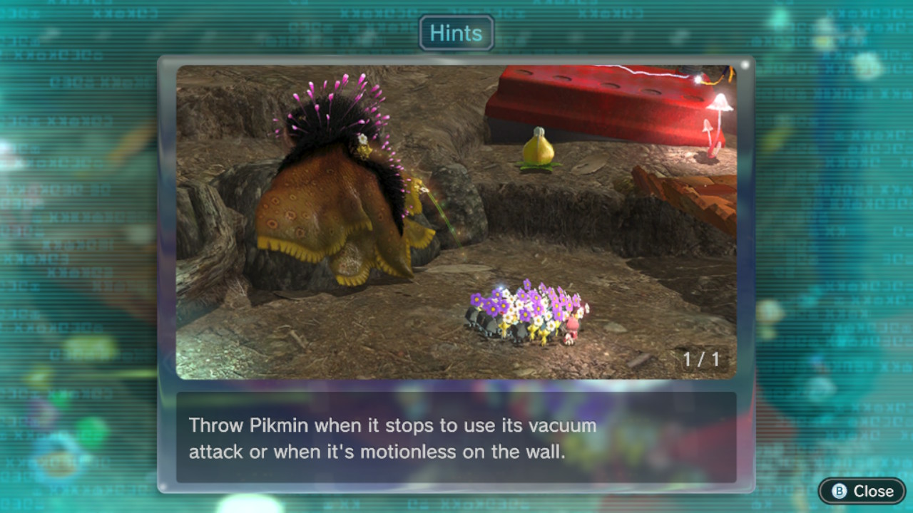 | Summary | Page 1 of the ninth unique hint in the Distant Tundra in Pikmin 3 Deluxe. This screenshot of the hint page should be replaced with the hint image itself when possible. |