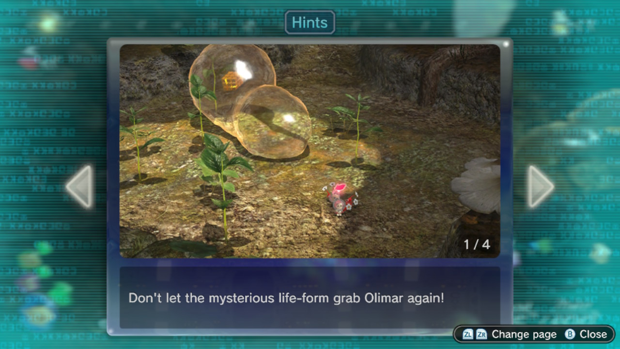 | Summary | Page 1 of the second unique hint in the Formidable Oak in Pikmin 3 Deluxe. This screenshot of the hint page should be replaced with the hint image itself when possible. |