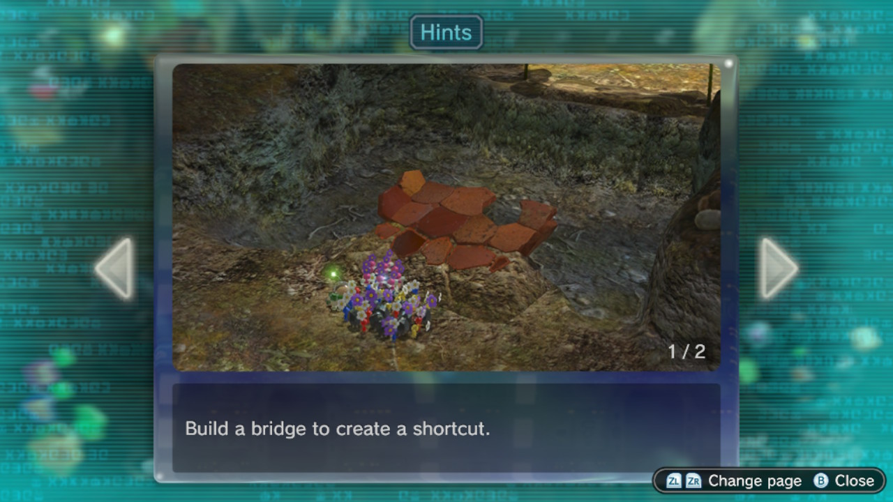 | Summary | Page 1 of the third unique hint in the Formidable Oak in Pikmin 3 Deluxe. This screenshot of the hint page should be replaced with the hint image itself when possible. |