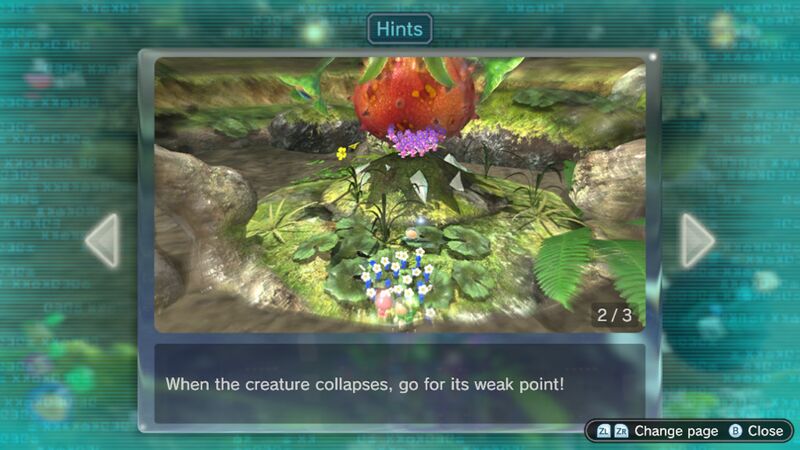 | Summary | Page 2 of the tenth unique hint in the Garden of Hope in Pikmin 3 Deluxe. This screenshot of the hint page should be replaced with the hint image itself when possible. |