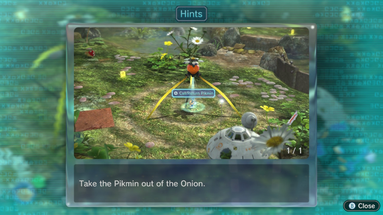 | Summary | Page 1 of the first unique hint in the Garden of Hope in Pikmin 3 Deluxe. This screenshot of the hint page should be replaced with the hint image itself when possible. |