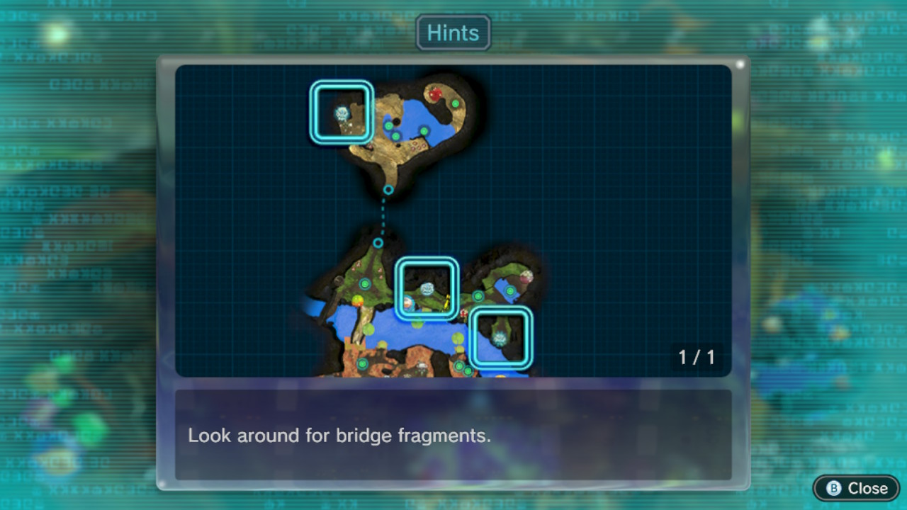 | Summary | Page 1 of the first unique hint in the Twilight River in Pikmin 3 Deluxe. This screenshot of the hint page should be replaced with the hint image itself when possible. |