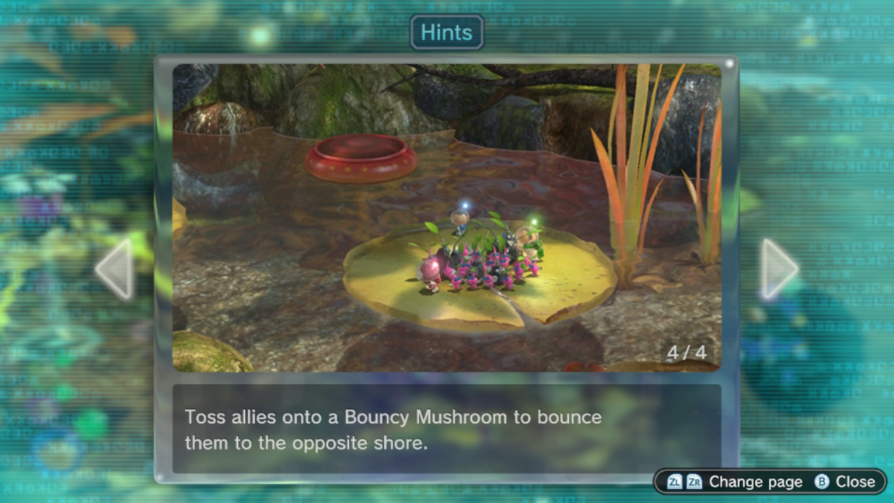| Summary | Page 4 of the fourth unique hint in the Twilight River in Pikmin 3 Deluxe. This screenshot of the hint page should be replaced with the hint image itself when possible. |