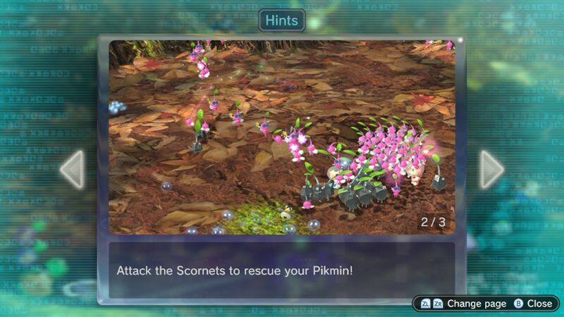 | Summary | Page 2 of the fifth unique hint in the Twilight River in Pikmin 3 Deluxe. This screenshot of the hint page should be replaced with the hint image itself when possible. |