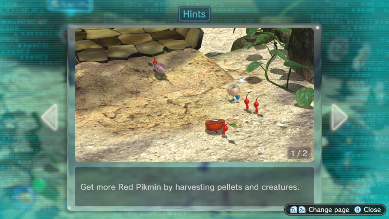 | Summary | Page 1 of the third unique hint in the Tropical Wilds in Pikmin 3 Deluxe. This screenshot of the hint page should be replaced with the hint image itself when possible. |