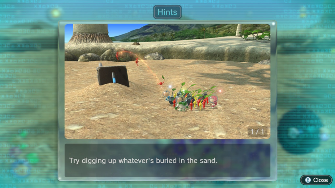 | Summary | Page 1 of the seventh unique hint in the Tropical Wilds in Pikmin 3 Deluxe. This screenshot of the hint page should be replaced with the hint image itself when possible. |