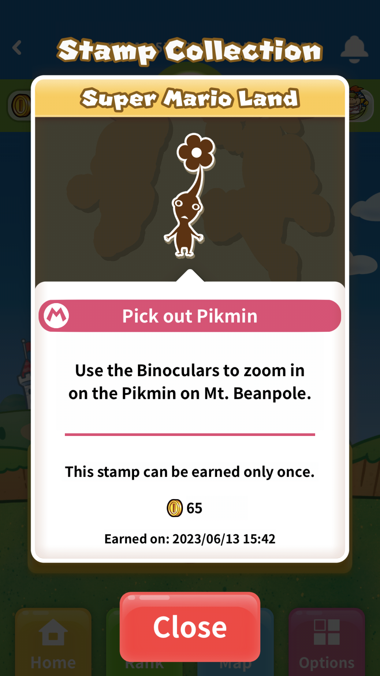 | Summary | The "Pick out Pikmin" stamp on the Super Nintendo World California app. |