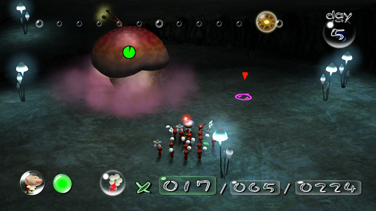 | Summary | A screenshot of a Puffstool spraying its spores in Pikmin 1 (Nintendo Switch). |