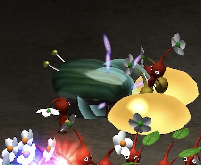 | Summary | A screenshot of Pikmin 'attacking' an Iridescent Flint Beetle in Pikmin 2 (Nintendo Switch). |