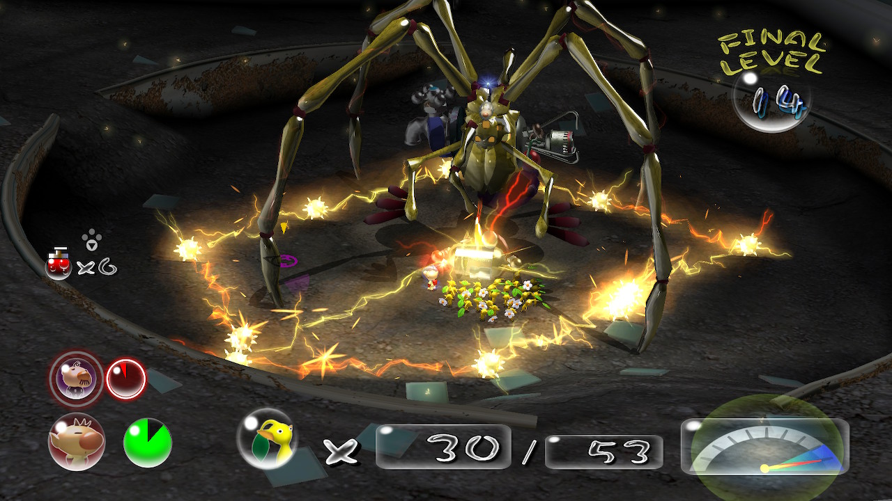 | Summary | A screenshot of the Titan Dweevil using the Shock Therapist in Pikmin 2 (Nintendo Switch). |