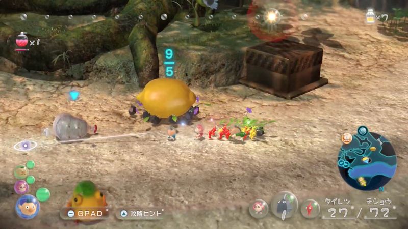 | Summary | A prerelease image for Pikmin 3 Deluxe, showing some Pikmin carrying a Face Wrinkler in the Tropical Wilds near sunset. From https://youtu.be/hJcbMY1JbCg?t=6 |