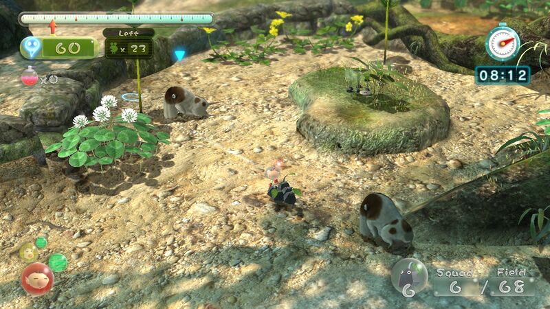 | Summary | A screenshot of Creature Hunting, showing 2 Bearded Amprats in an area usually occupied by water. Also note the Rock Pikmin sprouts on the small plateau. |