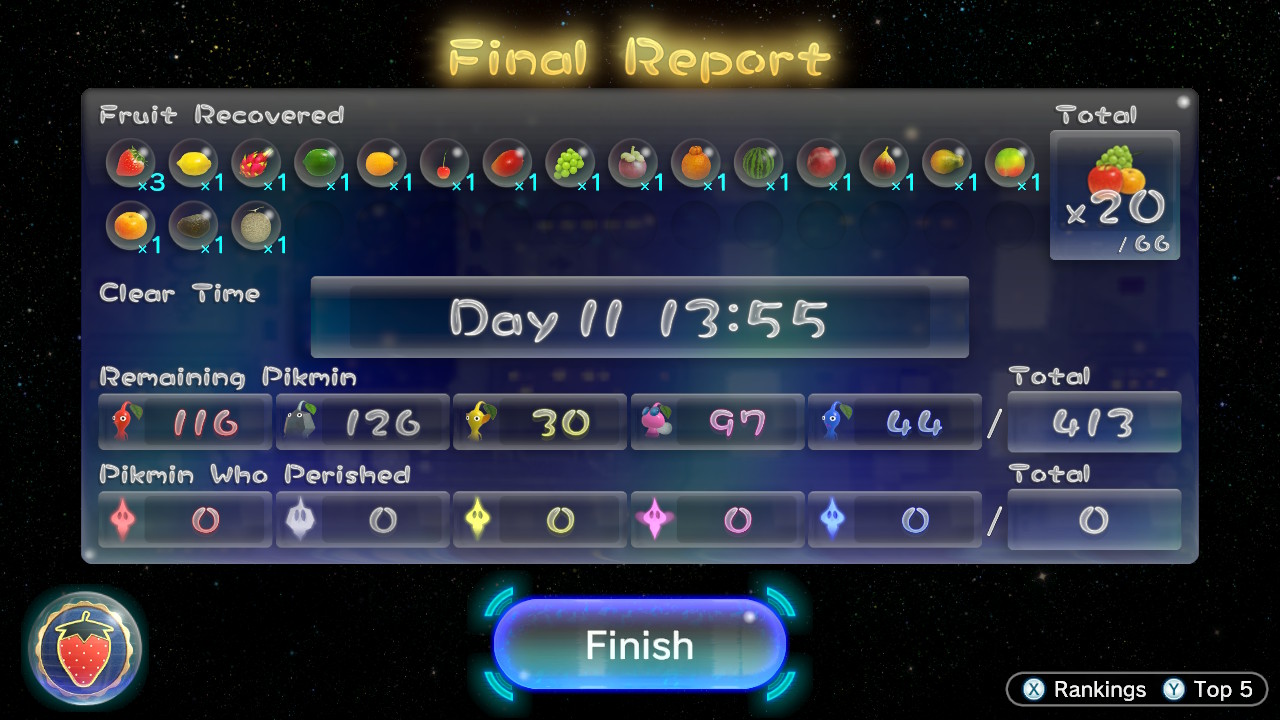 | Summary | The Final Report menu in Pikmin 3 Deluxe, showing the results of a run with 20 fruits collected, 11 days taken, and 0 Pikmin deaths. |
