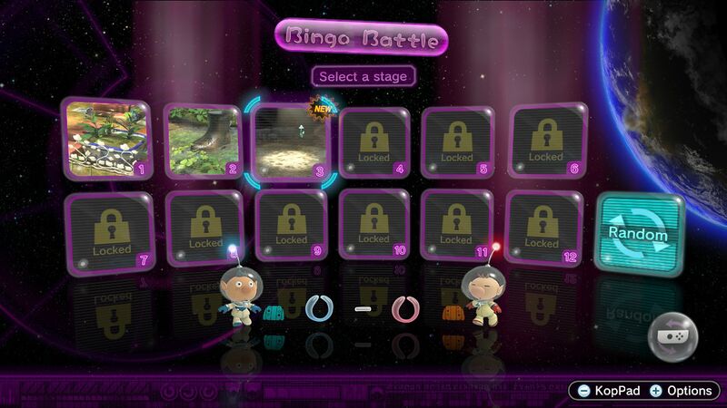 | Summary | The Bingo Battle menu in Pikmin 3 Deluxe with some stages unlocked and some stages locked. |