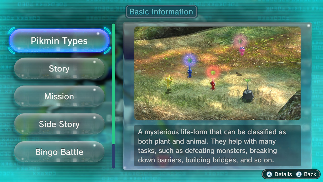 | Summary | The Basic Information menu in Pikmin 3 Deluxe, on its main page with the Pikmin Types option selected. |