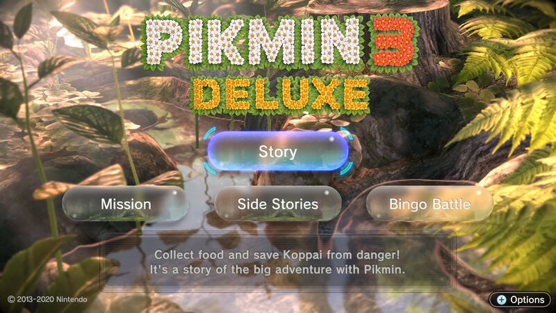 | Summary | The main menu in Pikmin 3 Deluxe, in evening lighting, with the cursor on Story. |