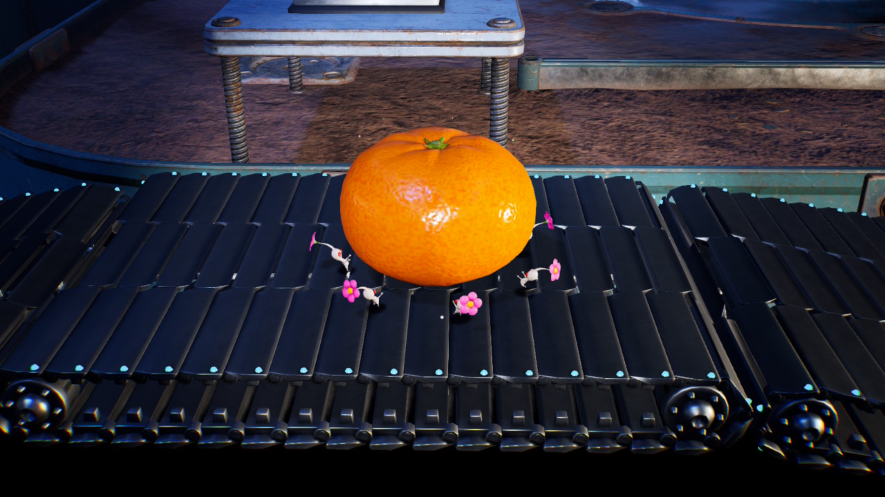Summary The Citrus Lump in the Doppelgänger's Den, being carried by some White Pikmin.