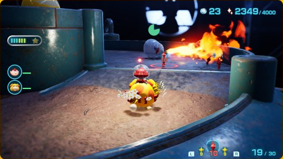 | Summary | A screenshot of Pikmin 4 showing a Fiery Blowhog in a cave. |