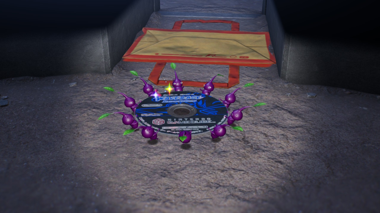 | Summary | The Glinty Circular Disc in the Engulfed Castle, being carried by 10 Purple Pikmin. A flattened bag is slightly north. |