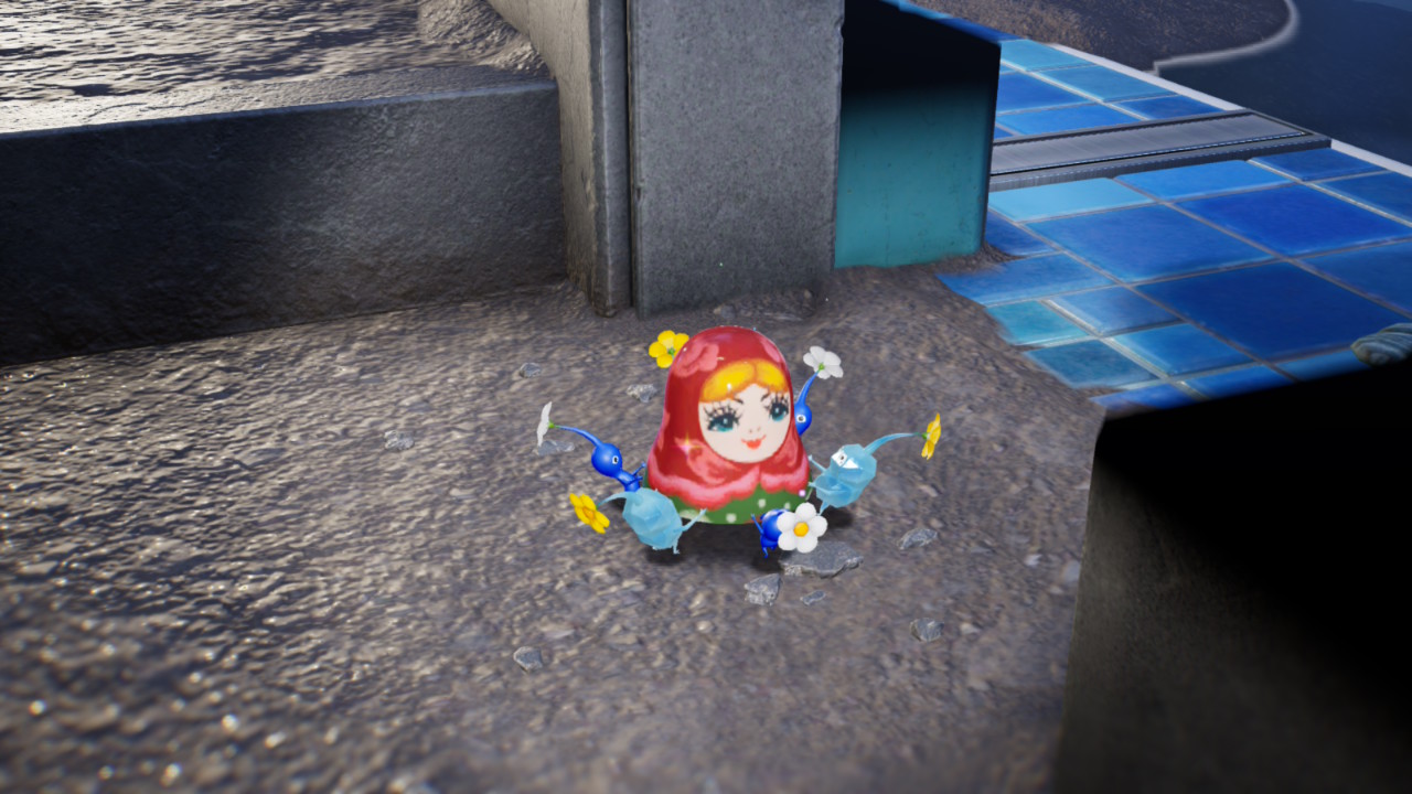 | Summary | The Granddaughter Doll Head in the Doppelgänger's Den, being carried by 3 Blue Pikmin and 3 Ice Pikmin. |