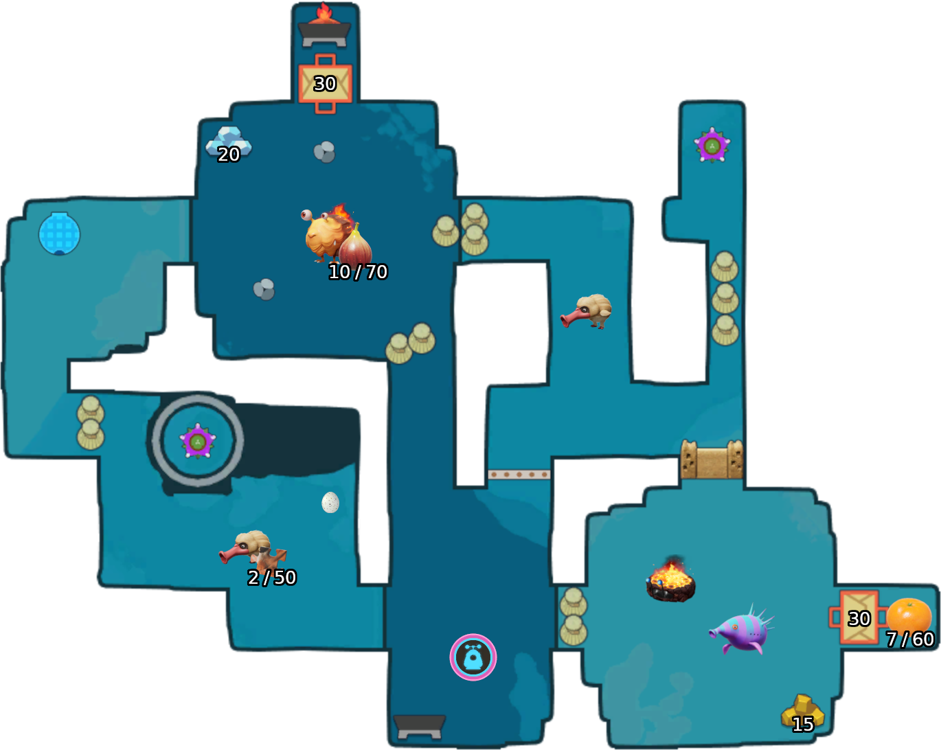 | Summary | Labeled map of sublevel 1 of the Cradle of the Beast. Numbers next to treasures indicate weight/Sparklium. |