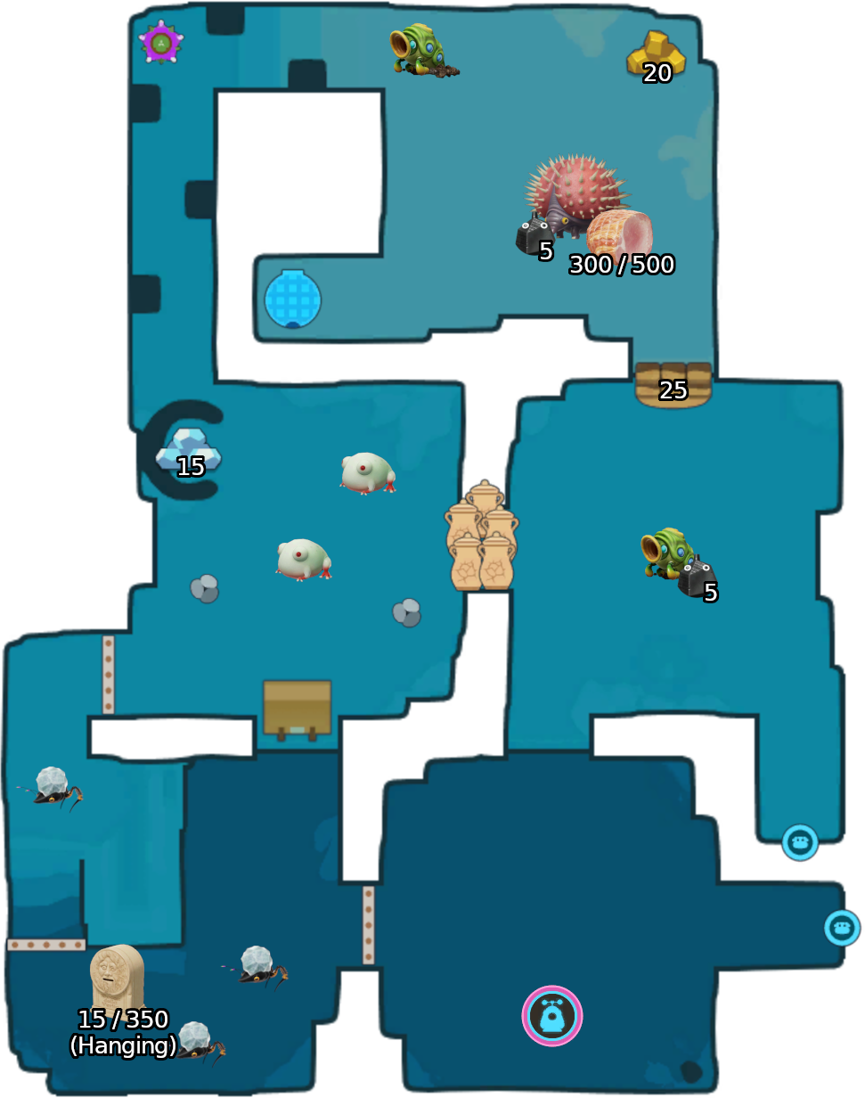 | Summary | Labeled map of sublevel 2 of the Cradle of the Beast. Numbers next to treasures indicate weight/Sparklium. |