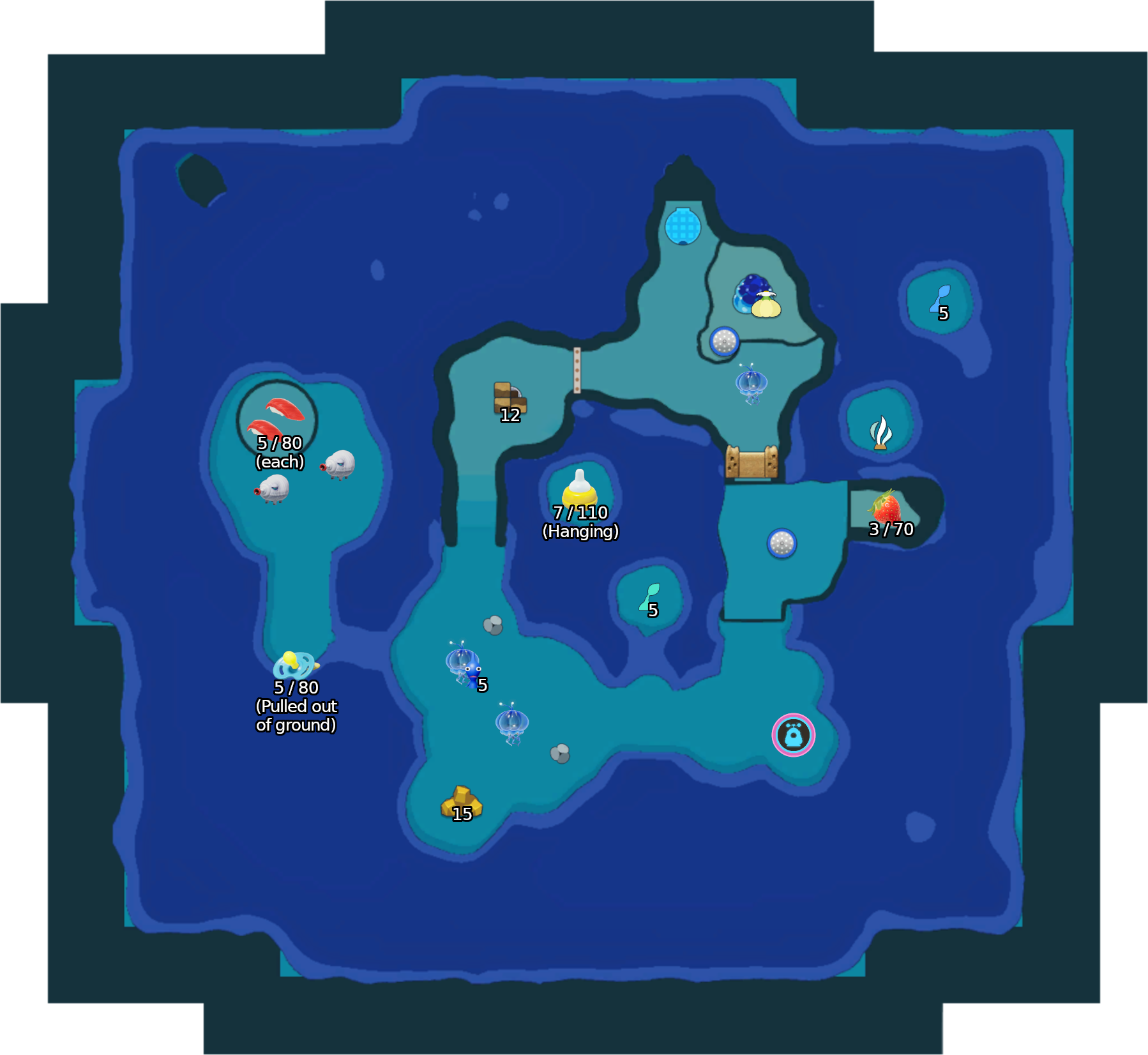 | Summary | Labeled map of sublevel 1 of the Seafloor Resort. Numbers next to treasures indicate weight/Sparklium. |