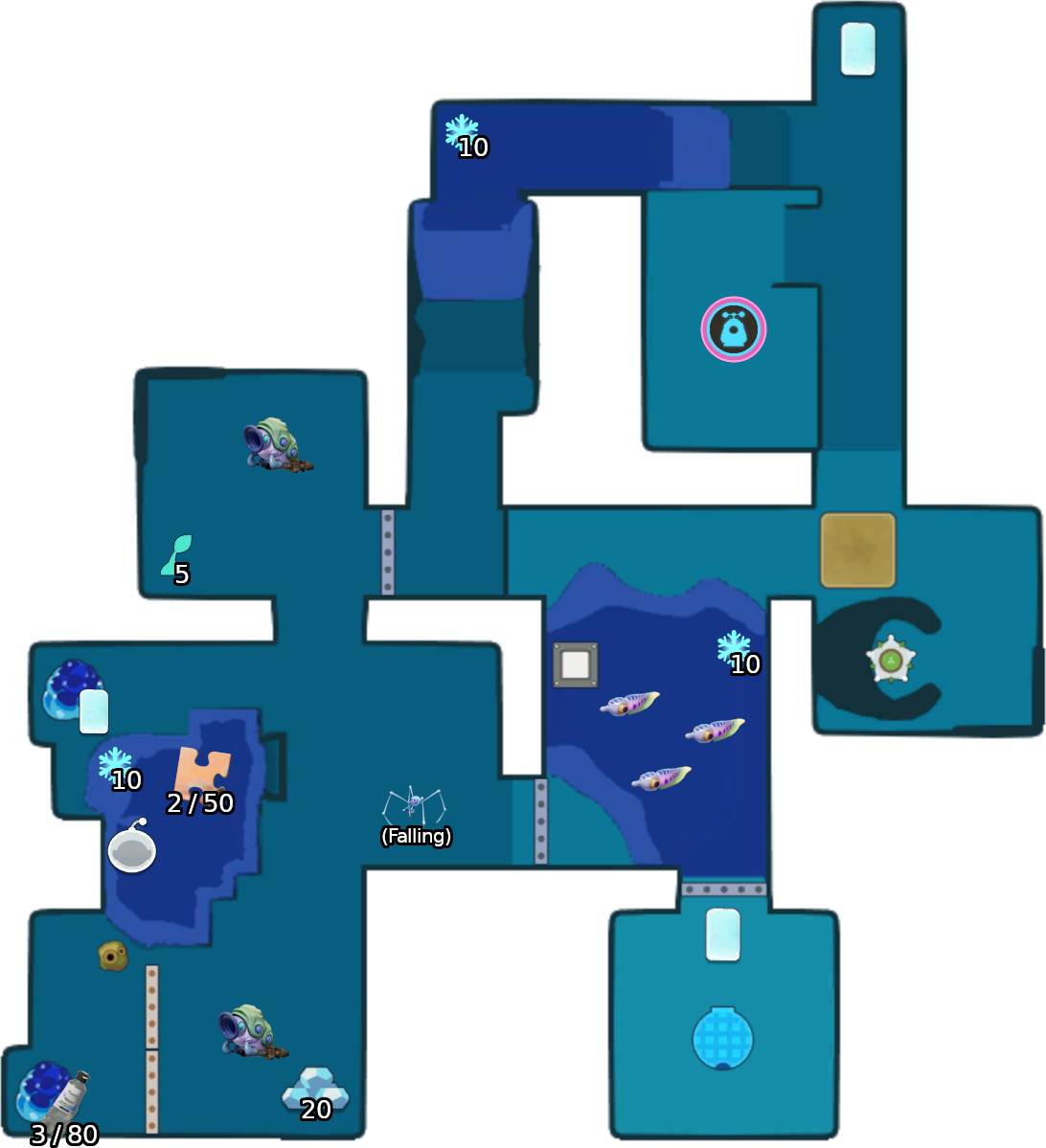 | Summary | Labeled map of sublevel 2 of the Subzero Sauna. Numbers next to treasures indicate weight/Sparklium. |