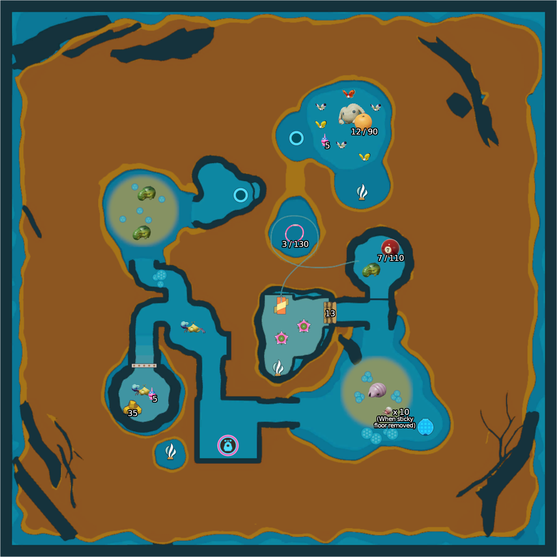 | Summary | Labeled map of sublevel 1 of the The Mud Pit. Numbers next to treasures indicate weight/Sparklium. |