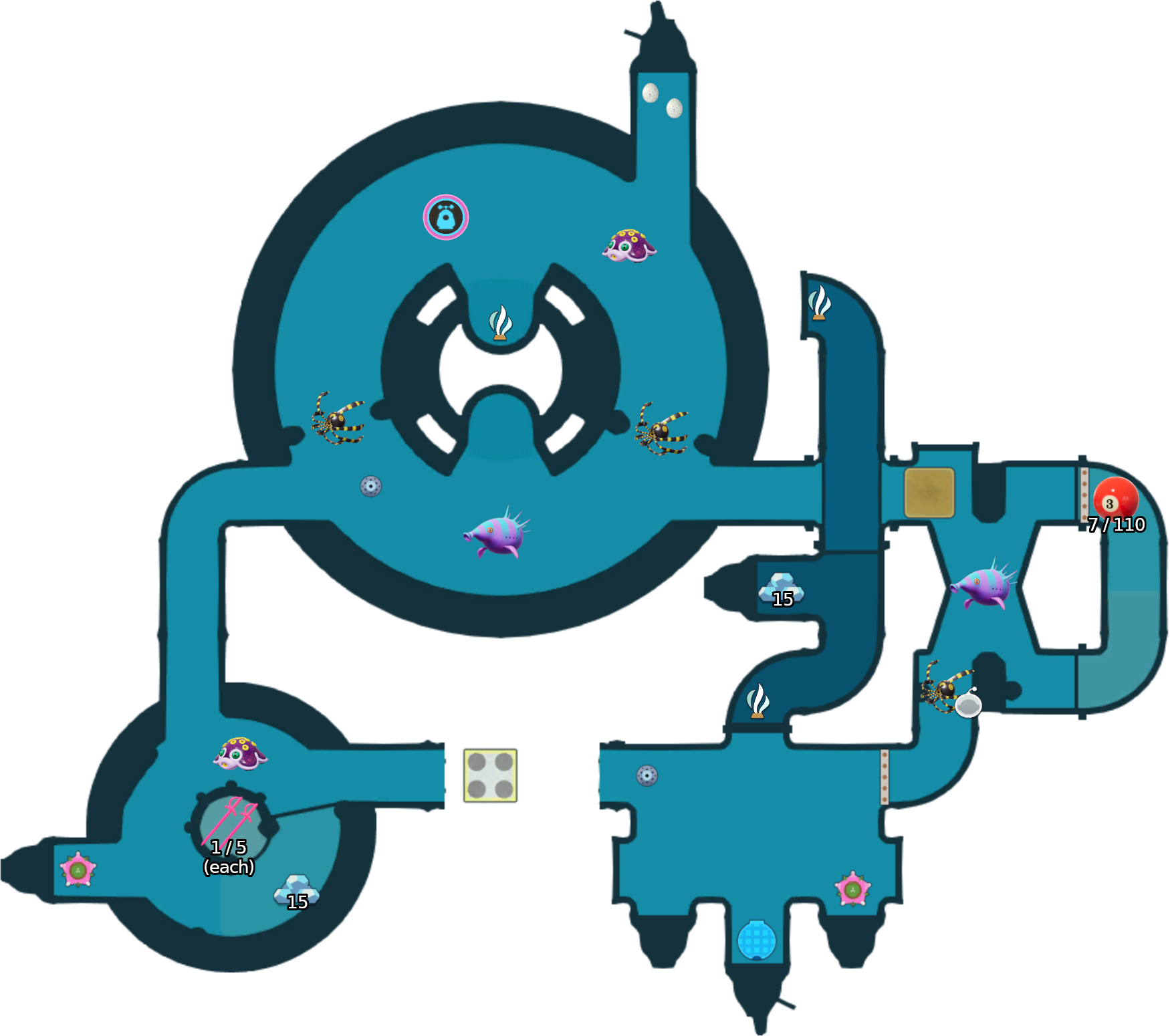 | Summary | Labeled map of sublevel 3 of the Ultimate Testing Range. Numbers next to treasures indicate weight/Sparklium. |