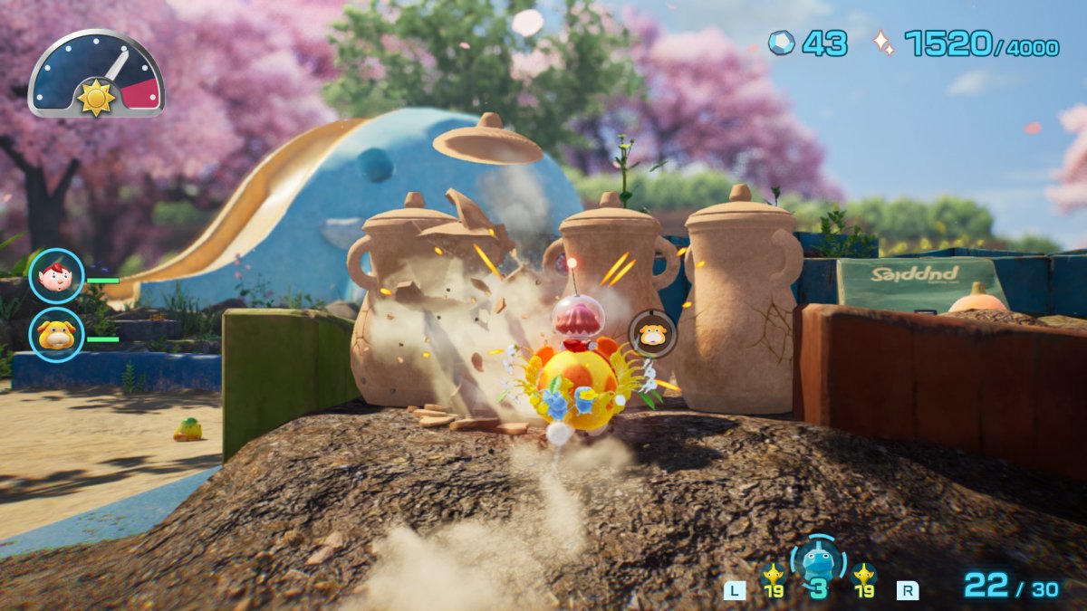 | Summary | A screenshot of Pikmin 4 showing Oatchi breaking some jars. |
