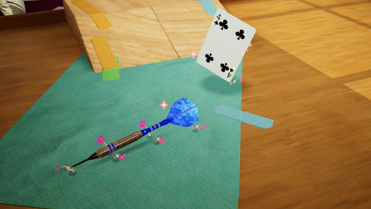 | Summary | The Relentless Spear and the Wisdom Emblem in the Hero's Hideaway, each being carried by White Pikmin. |