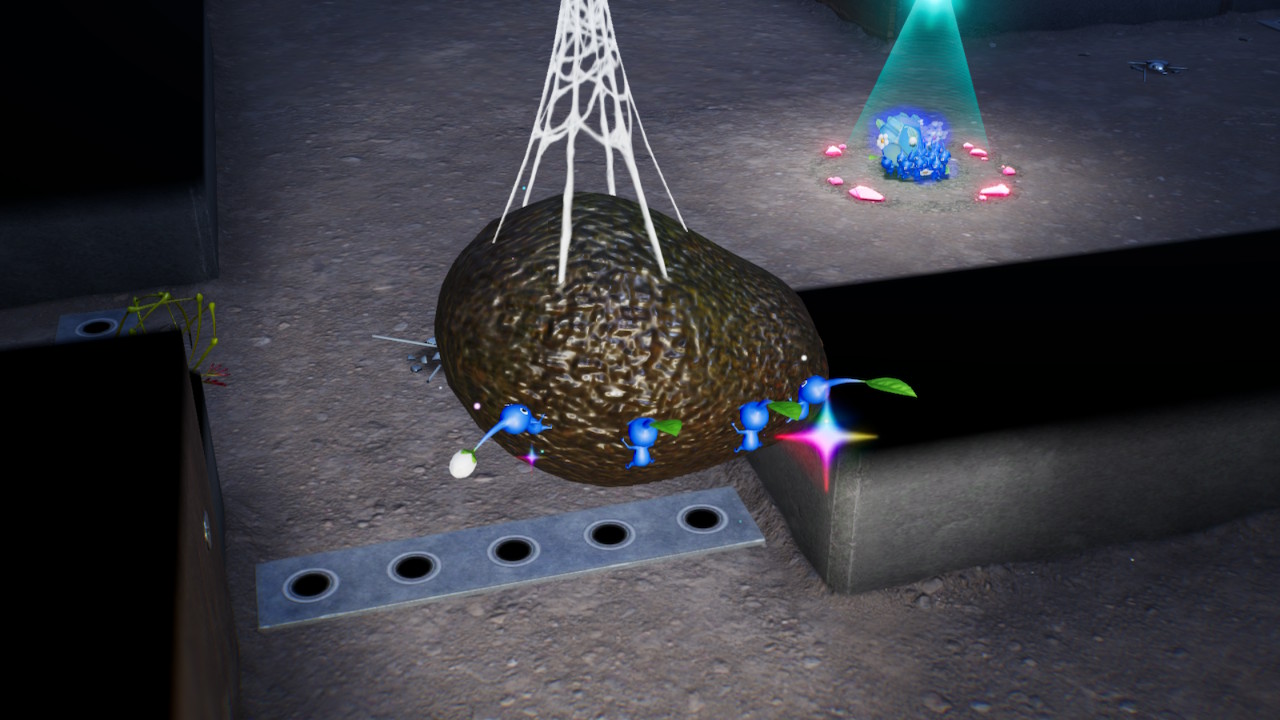| Summary | The Scaly Custard in the Engulfed Castle, being latched onto by 4 Blue Pikmin. |