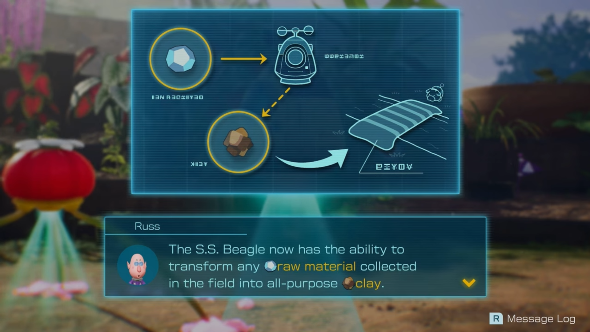 | Summary | Tutorial diagram explaining how to use raw material to build clay structures in Pikmin 4. |