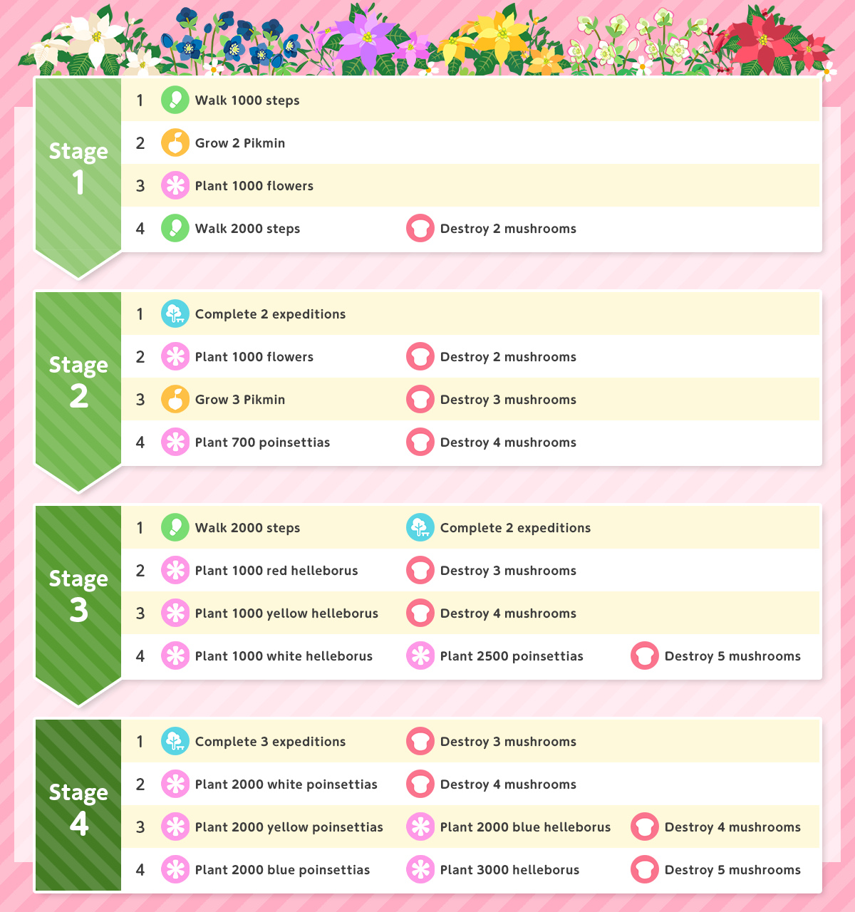 | Summary | List of Event Challenge missions for the 2024 Holiday Event in Pikmin Bloom. |