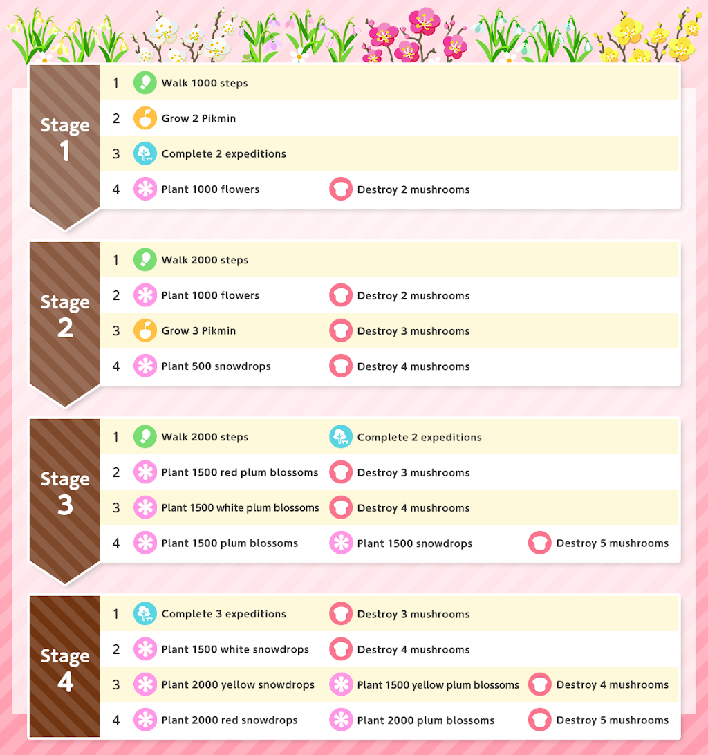 | Summary | List of Event Challenge missions for the 2025 Valentine's Day Event in Pikmin Bloom. |