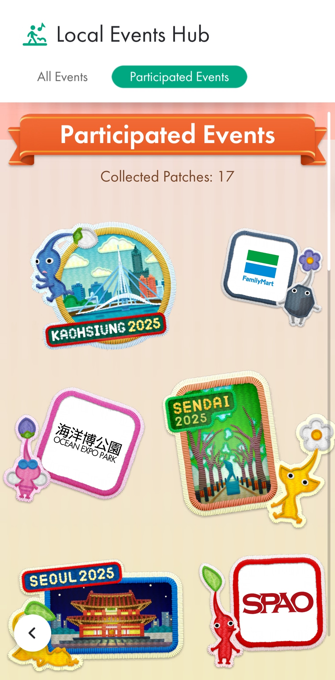 | Summary | A screenshot of the "Participated Events" section of the Local Events Hub in Pikmin Bloom, showing various Local Event Patches. |