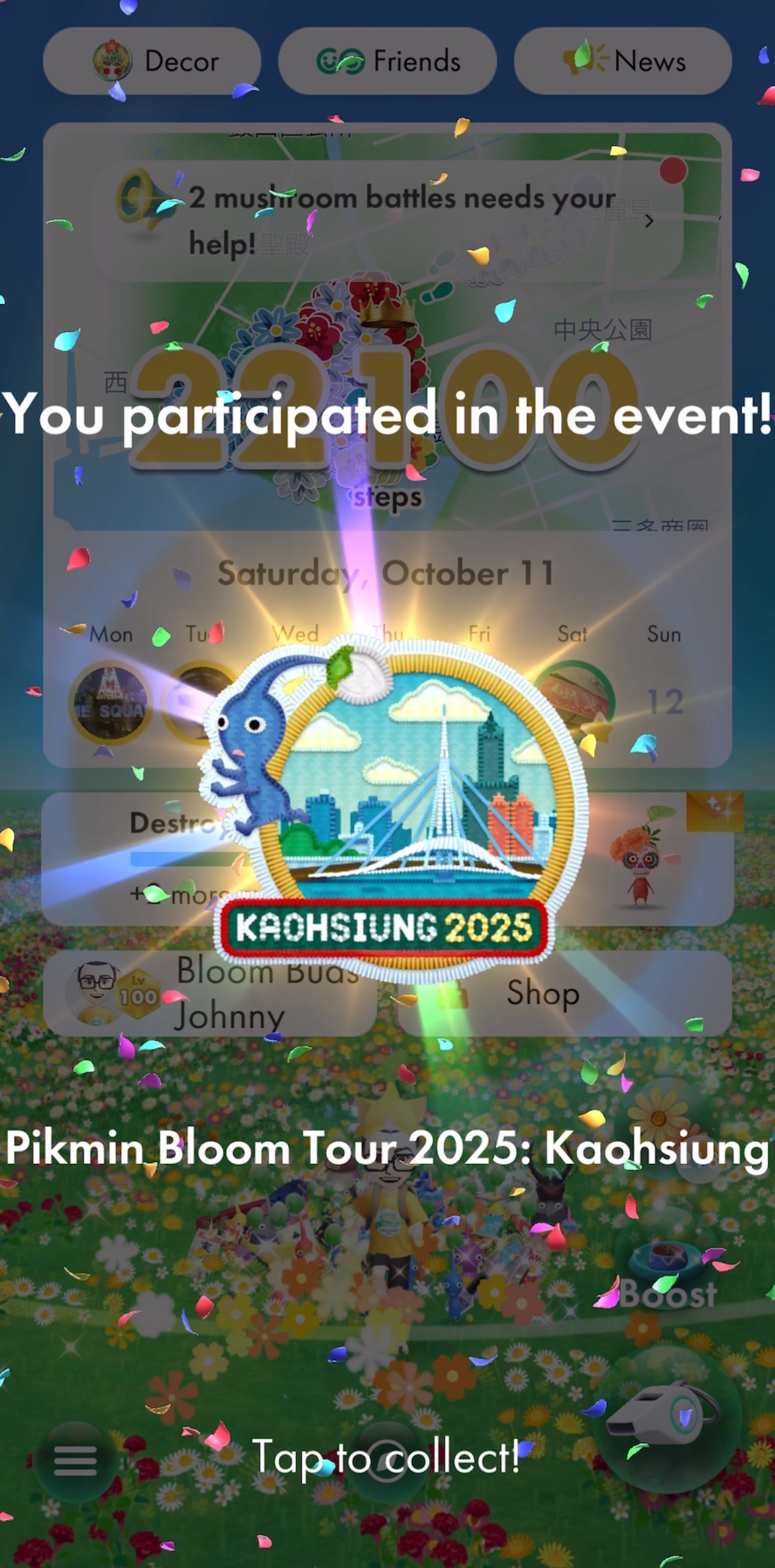 | Summary | A screenshot of a Local Event Patch being earned in Pikmin Bloom. |