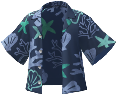 | Summary | "Tropical Print Shirt (Navy)" Mii outerwear part in Pikmin Bloom. |