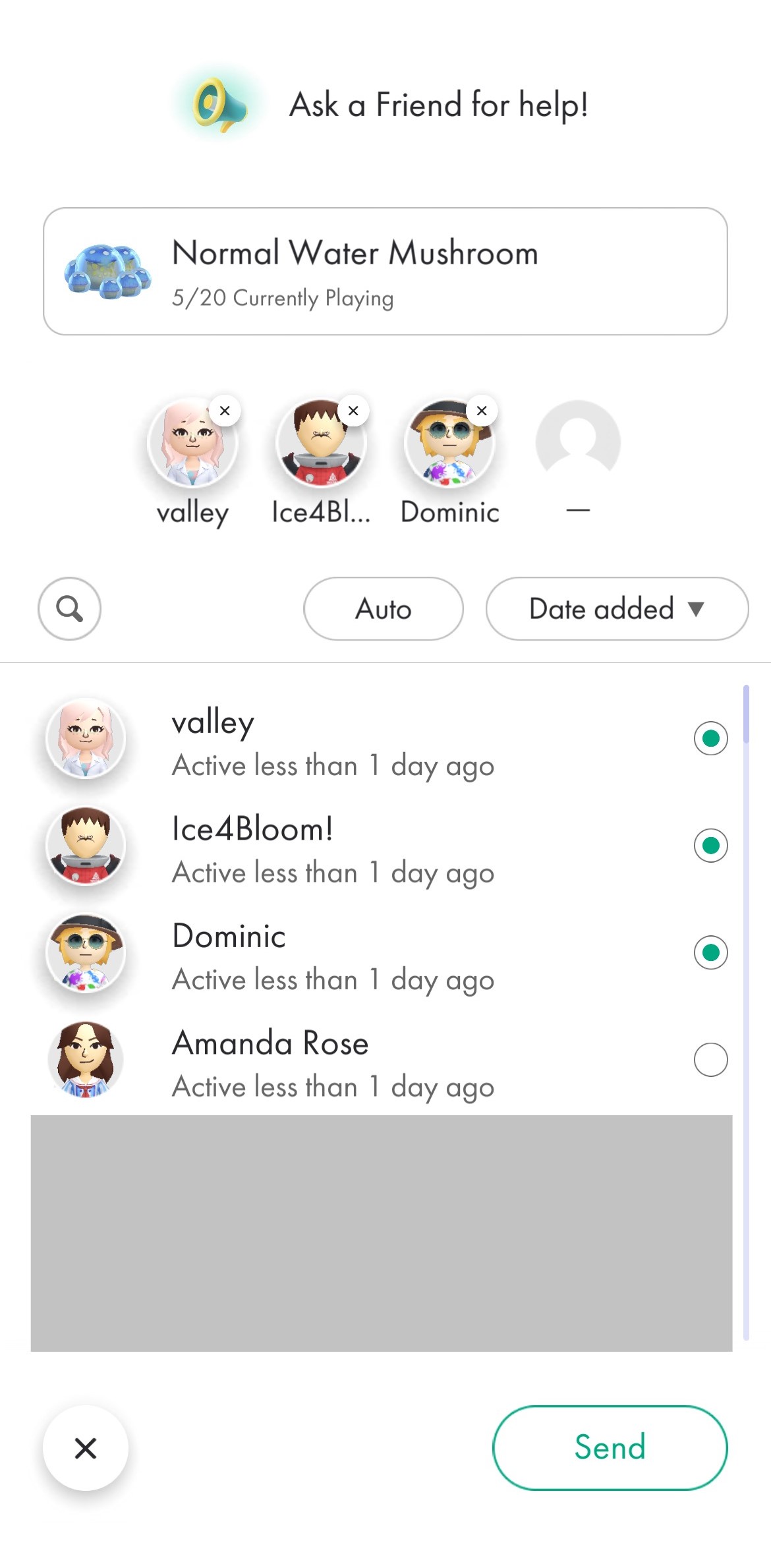 | Summary | The menu to choose which friends to call to a mushroom using a Mushroom Battle Bullhorn in Pikmin Bloom. |