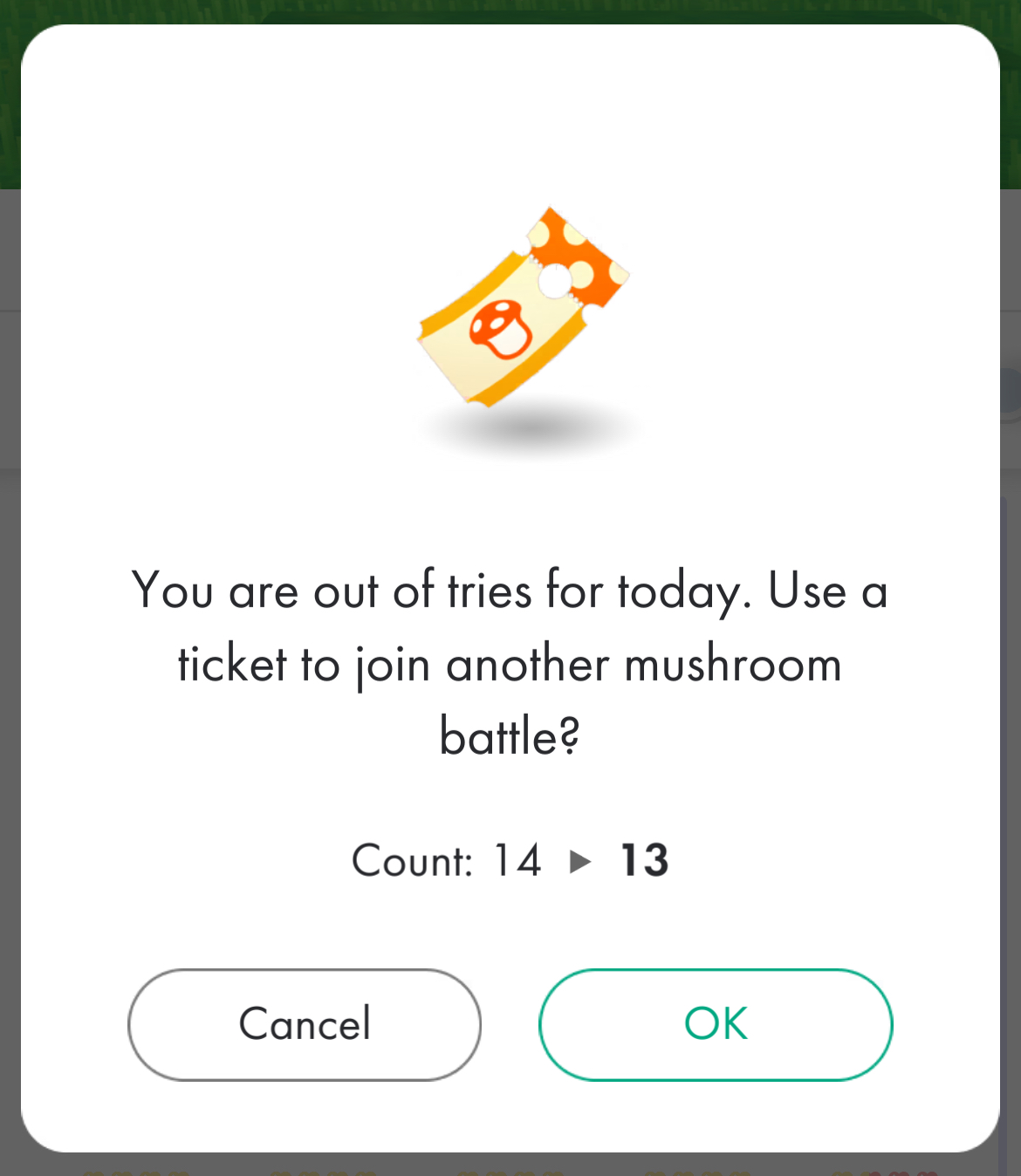 | Summary | The confirmation menu that appears after a player clicks the GO button to join a mushroom with a Mushroom Recharge Ticket in Pikmin Bloom. |